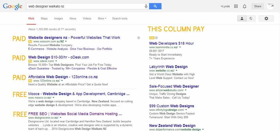 The results in the column to the right all pay for their position. The results in the left column at the top of the page also pay for their position. The results in the left column, underneath the paid adverts, are generic unpaid results. They are there purely through very good SEO optimisation throughout their website. Please note Dezignscene is second with a further 8 results below not showing. This is the service that Dezignscene provides for all it's clients at no extra charge, yes part of our service.